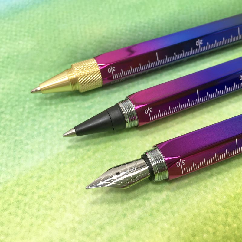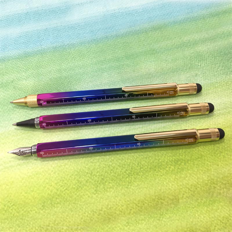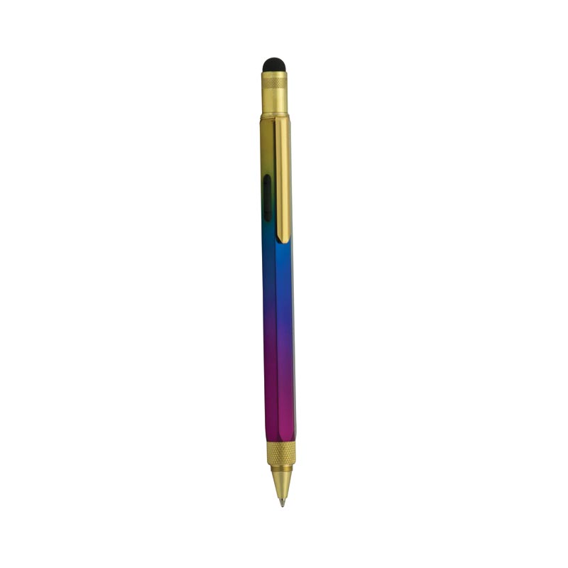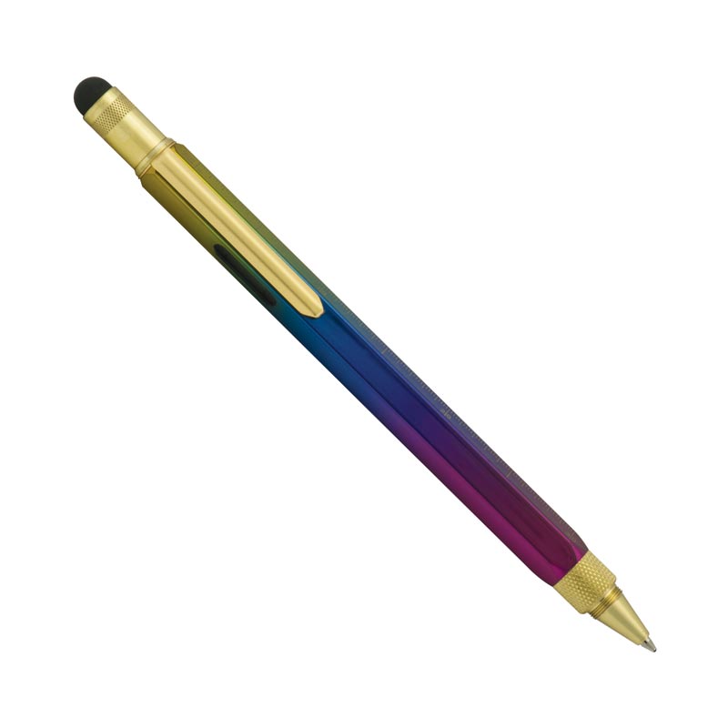Rainbow-bright Monteverde ballpoint pen. The ballpoint pen with many talents. The Rainbow Tool Pen features a heavyweight 6-sided brass barrel which houses a ballpoint pen at one end and an ultra-sensitive touch screen stylus at the other—plus a ruler and Phillips and flathead screwdrivers. The PVD coating over the pen’s solid brass body provides vibrance, luster and durability. Purple, blue, green and yellow rainbow hues reflect on the mirror-like surface of the pen. Gold plating adorns the clip and trim.