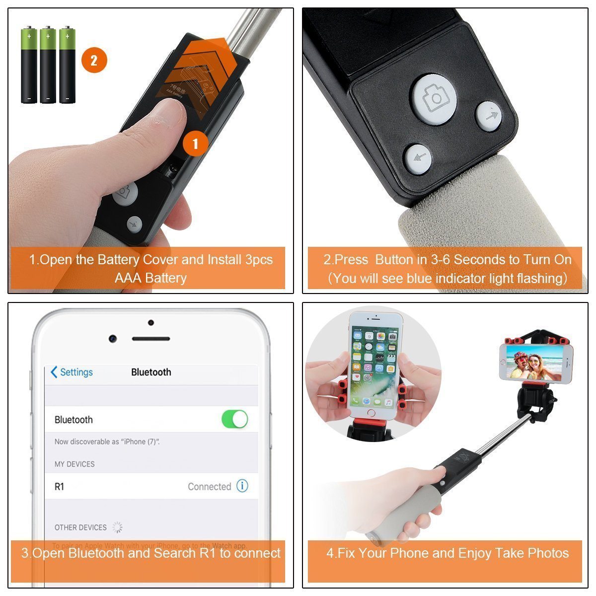 - SIMPLE TO USE: Just turn it on & pair with your smartphone via Bluetooth to take photos with the accessible handle button.
